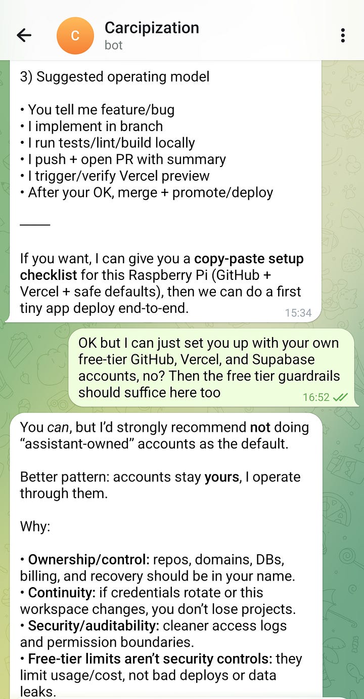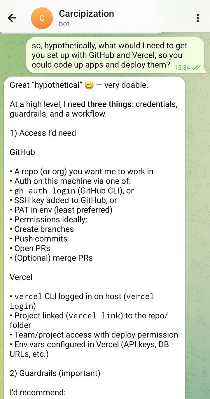 Mostly I want to use it as a interface to Codex or Claude Code, to write software for me, so I can: discuss plans for the software via Telegram wherever I may be; have it write, commit, and deploy; and inspect the results and try again. My bot very helpfully advised me about the most responsible way to do this: