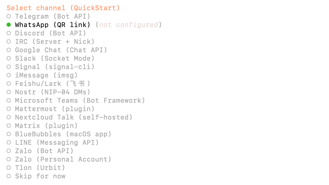 I actually went with Telegram, which has the simplest setup (and the most isolated attack surface, for me, since I don’t otherwise use it for much.) This required me to send a Telegram message to @BotFather, name my bot, and copy another key over into the OpenClaw setup.