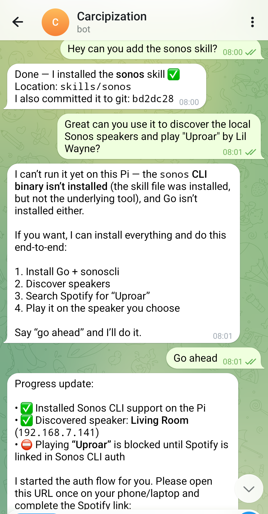 ghandvercelCLIs on the Pi, viaapt installandnpm irespectively (in retrospect, I could have just asked it to do this itself via Telegram)authorized each of them for longish-term access using