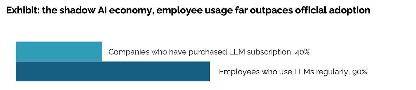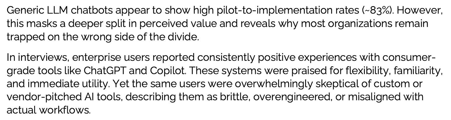 95% of custom-built internal tools that use AI in highly specific ways “fail,” i.e. never graduate from pilot projects to widespread implementation. (It’s a slightly wacky metric, measured in an equally wacky way, but let’s go with it.)