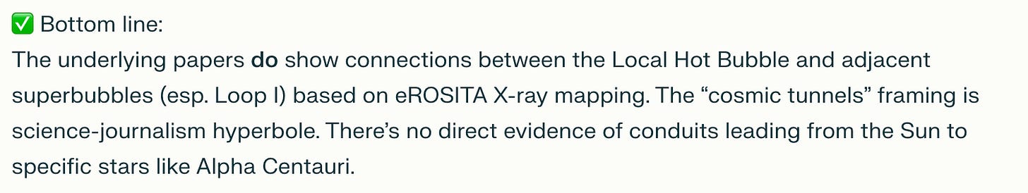 Actual article beneath the headline: "confirmed that the Sun sits inside a giant bubble of hot gas, and within it, there might be strange “interstellar tunnels” connecting us to other star systems."